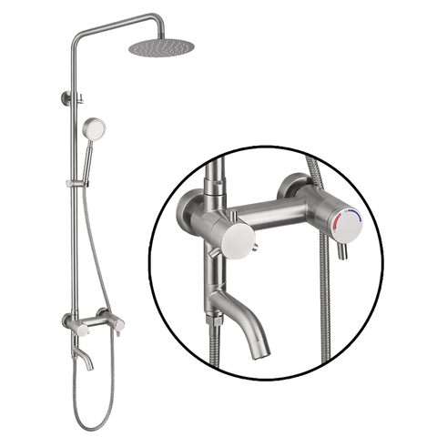 Juego de ducha de acero inoxidable montado en la pared con doble manija contemporánea Acabado cepillado con núcleo de válvula de cerámica con patrón de lluvia y chorro