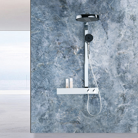 Grifos de baño y ducha termostáticos contemporáneos de 5 funciones, nuevo estante de almacenamiento de latón para el hogar, masaje de chorro de lluvia y patrones de pulverización suave