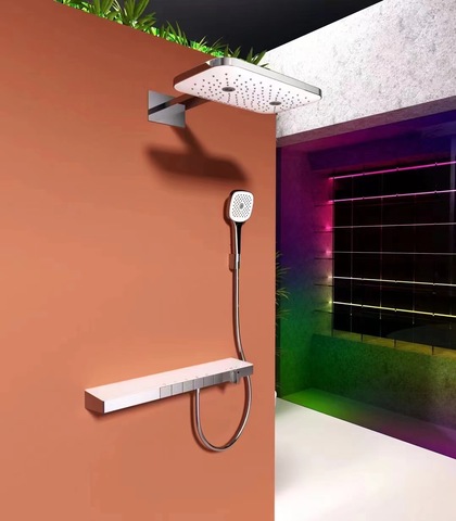 Juego de baño moderno de lujo para el hogar, bañera montada en la pared con luz expuesta con chorro de lluvia de latón, aerosoles de pausa suaves para masaje